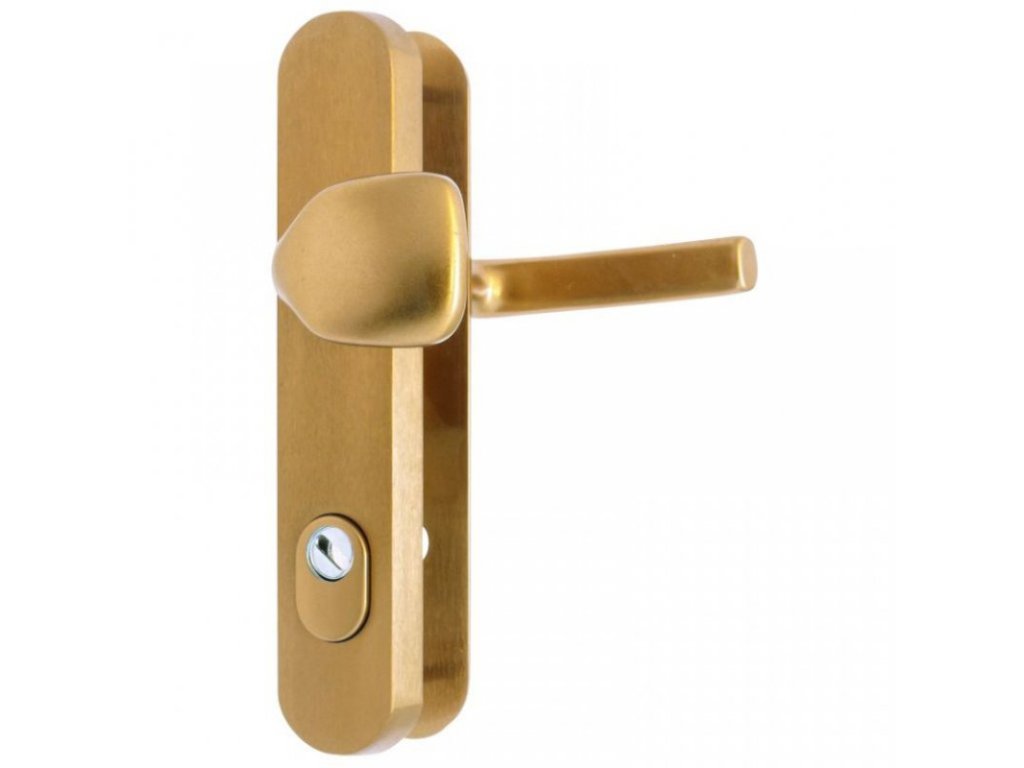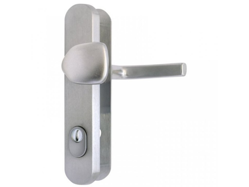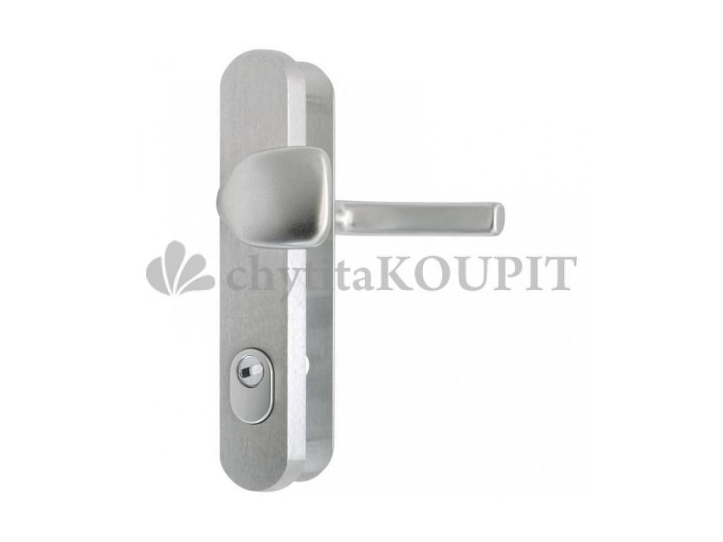 Bezpečnostní štítové kování s překrytem vložky. 3. bezpečnostní třída, vhodné např. pro vstupní dveře domů a bytů.
