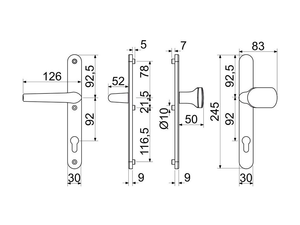 • RHD.005 72 – 92 mm - po zkrácení čtyřhranu a šroubů od tloušťky dveří 40 mm
