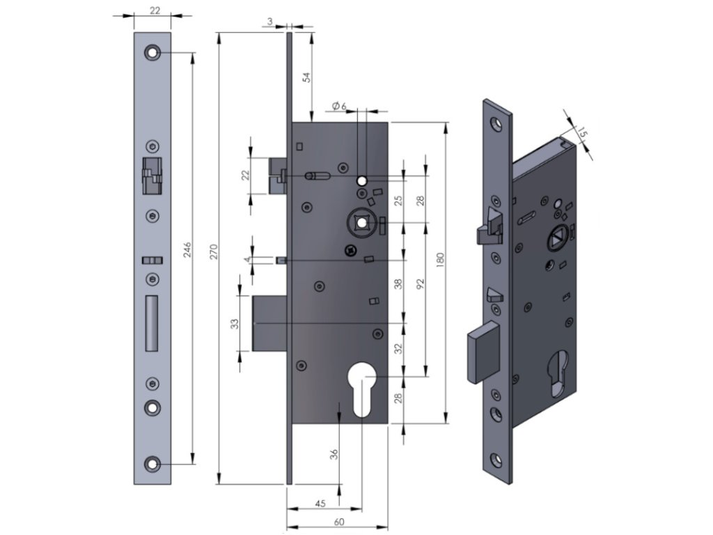 • Rozteč 92 mm, backset 45 mm, čelo 24 mm