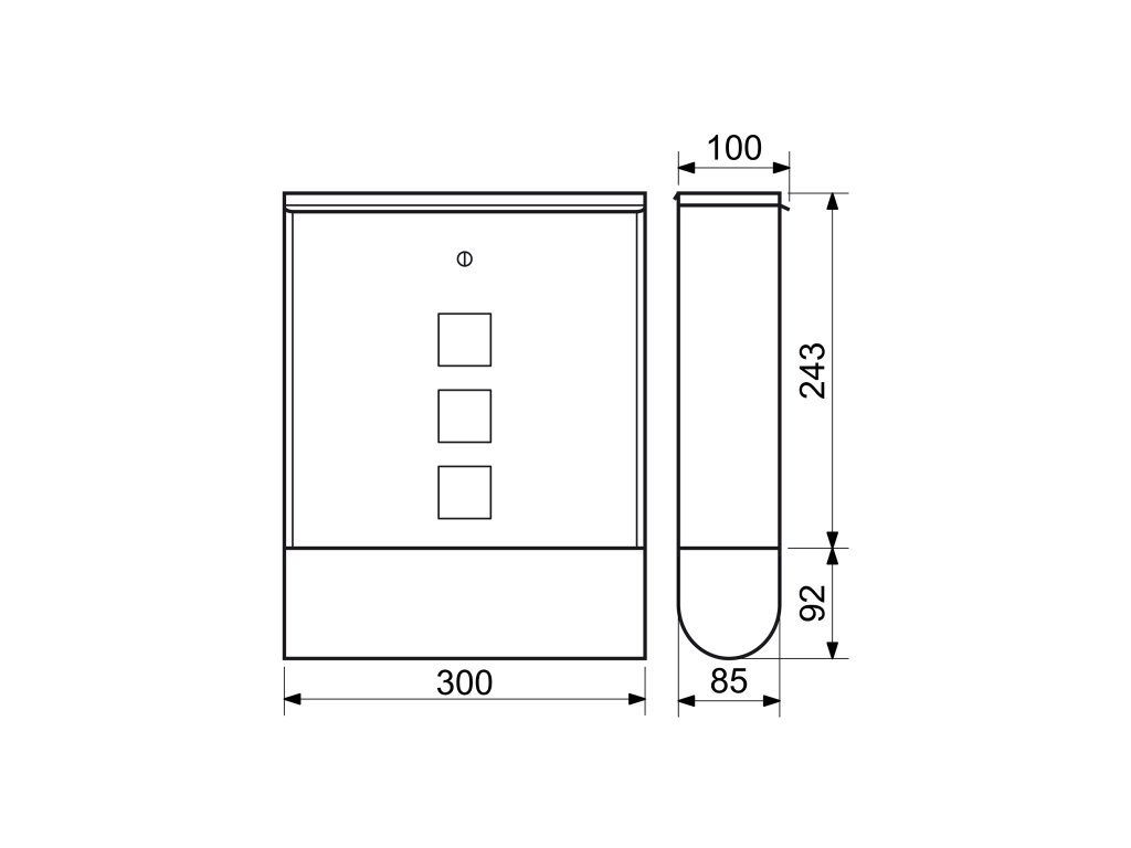 Schránka má rozměry 305 x 335 x 100 mm (šířka x výška x hloubka), což je optimální velikost pro vaše poštovní zásilky. Rozměr vhozu činí 300 x 30 mm (šířka x výška), což umožňuje snadné a pohodlné vhazování pošty.
