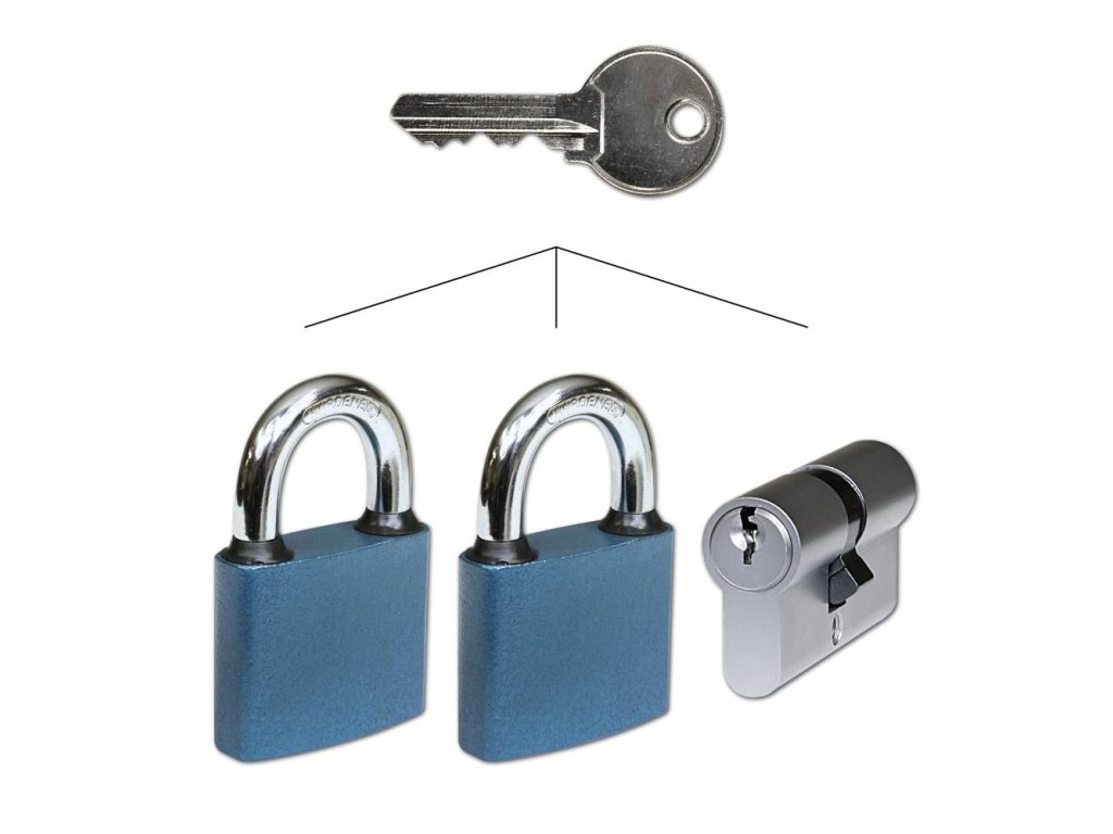 Set na společný uzávěr – „SU“ obsahuje 2 ks visacího zámku (RV.OVAL.52) a 1 ks cylindrické vložky (EO.30/35.NI)