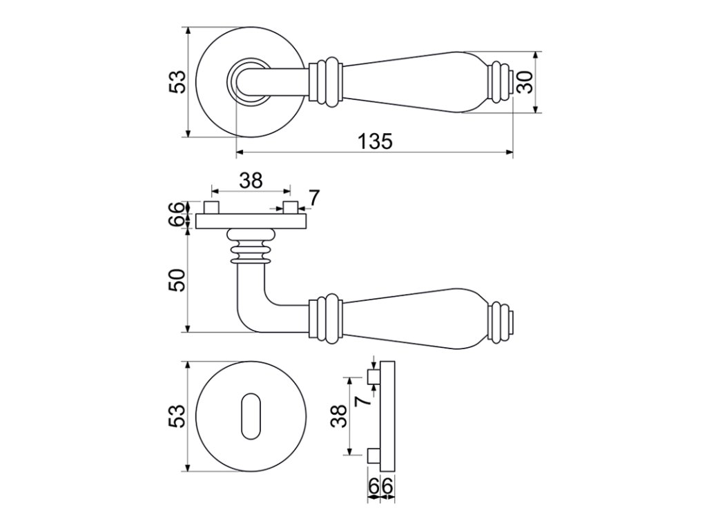 Zamakové kování na čtvercových, kulatých a obdélníkových rozetách s vratnou pružinou klik