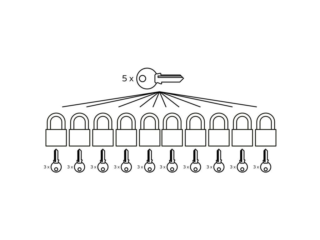 • Hlavní „zlatý“ klíč ovládá všechny zámky sestavy, ostatní vlastní „stříbrné“ klíče pouze svůj zámek
