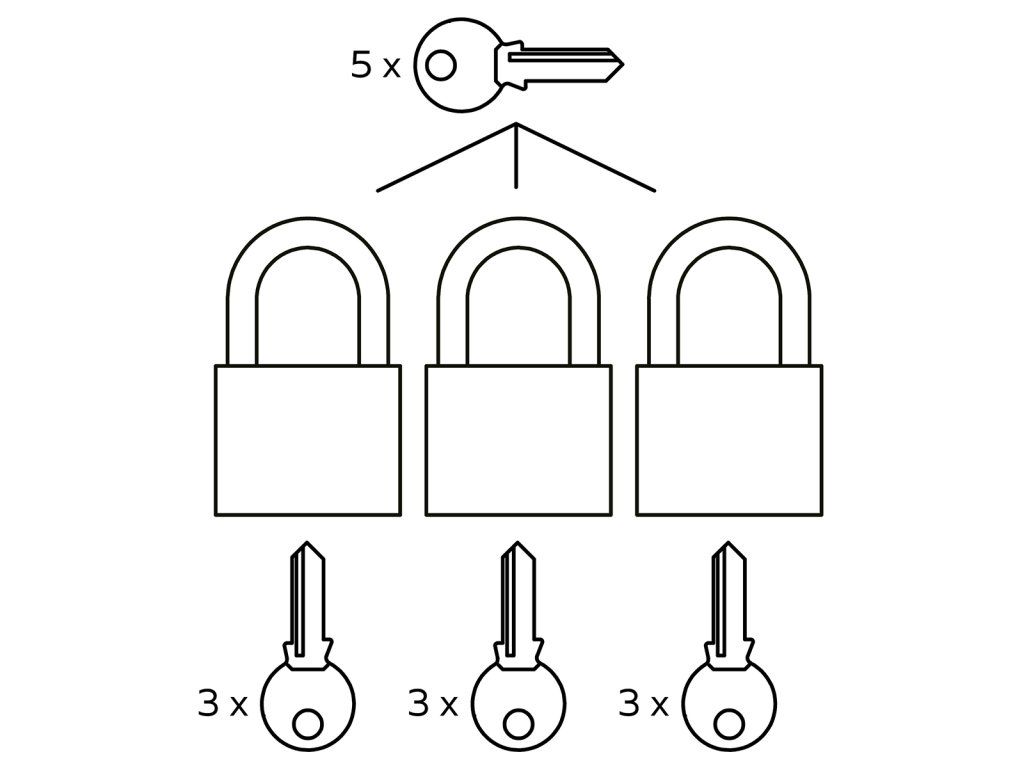 • Hlavní „zlatý“ klíč ovládá všechny zámky sestavy, ostatní vlastní „stříbrné“ klíče pouze svůj zámek