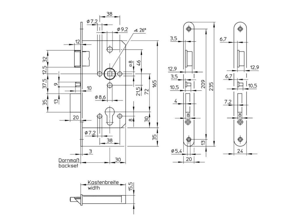 - Rozteč 72 mm, backset 55 mm, čelo 20 mm