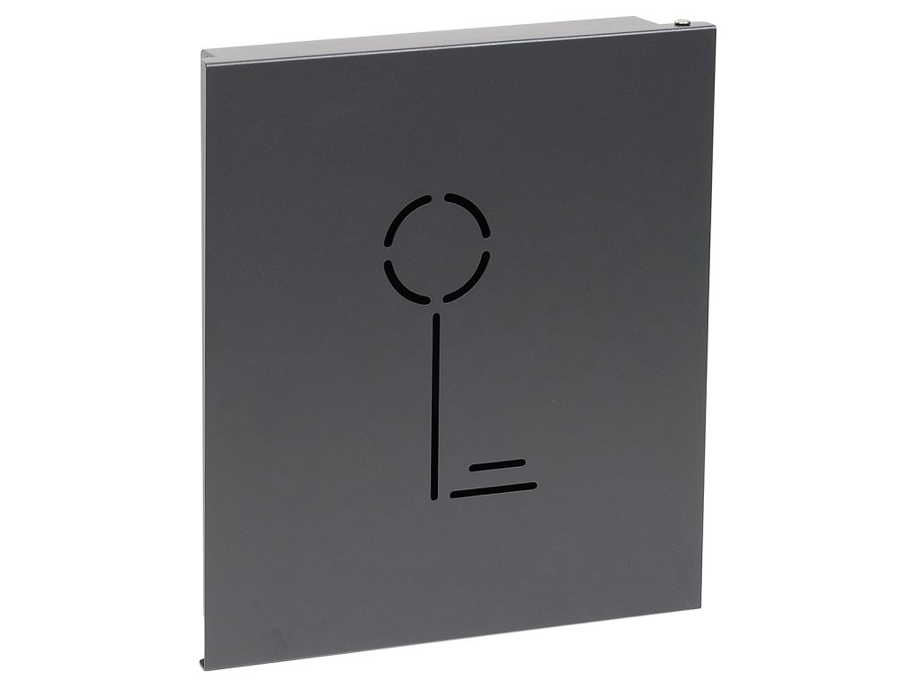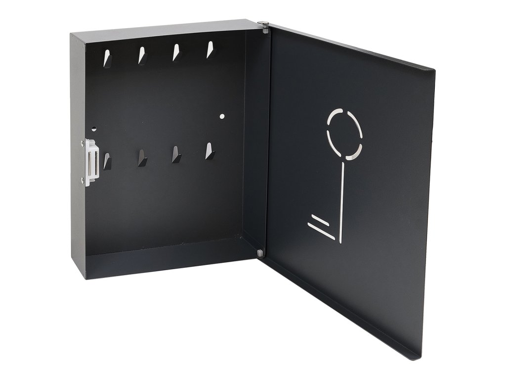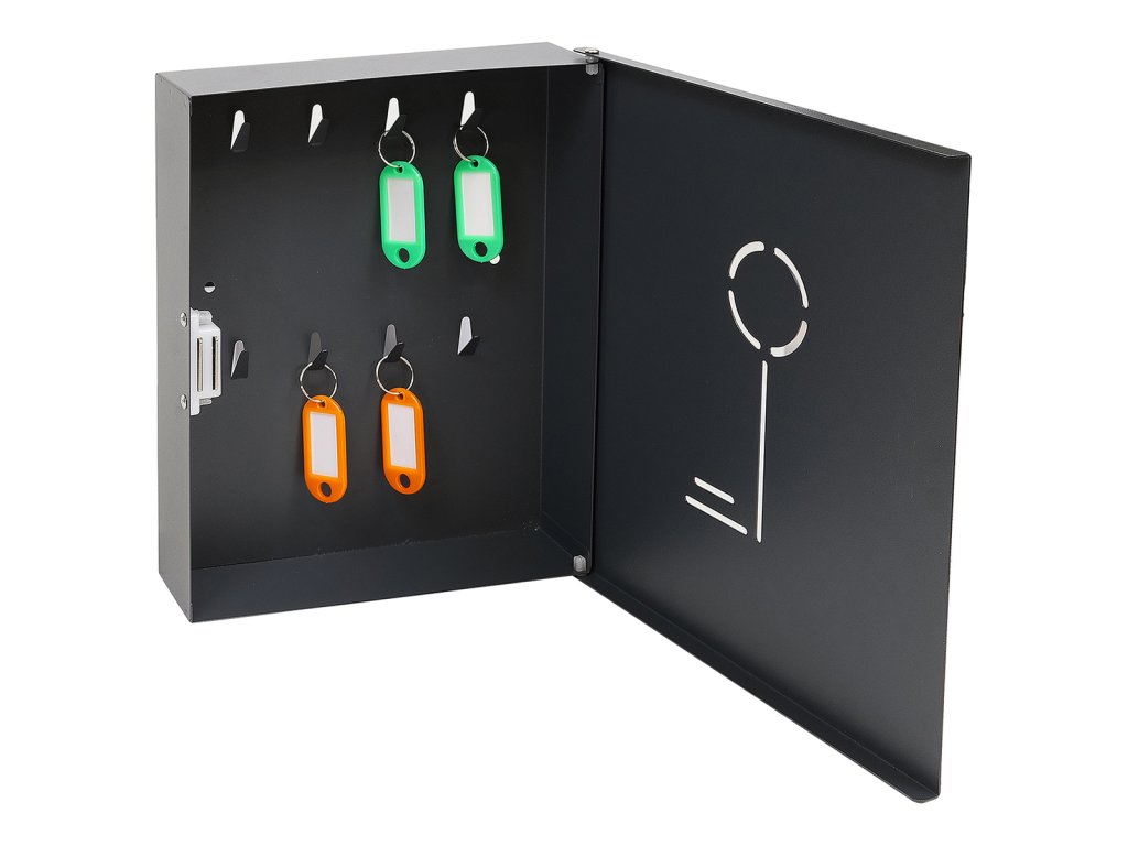 Praktická kovová schránka na klíče s moderním designem v antracitově matné barvě. Díky přehlednému vnitřnímu uspořádání a přiloženým barevným jmenovkám s kroužky umožňuje snadnou organizaci a rychlou identifikaci klíčů.